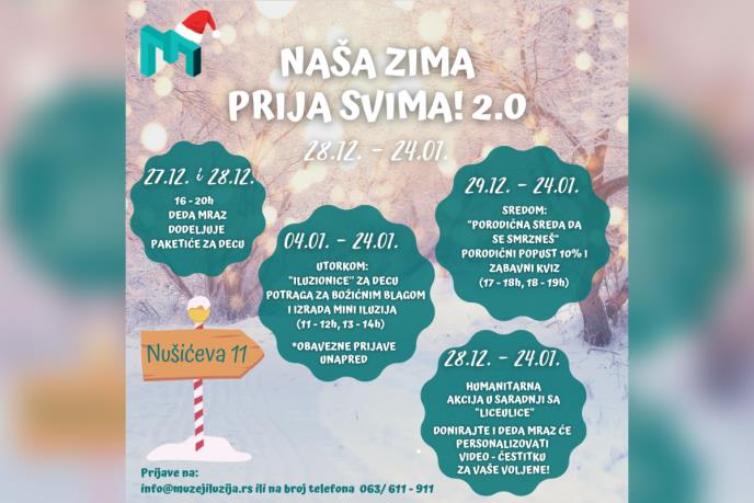 Možda zima ne prija svima, ali ova će se pamtiti. U periodu od 24.12-21.1.2022, u okviru manifestacije Naša zima prija svima 2.0, Muzej iluzija u Nušićevoj 11, priprema spektakl za sve generacije! 27. i 28.12.od 16-20 h, za svu decu koja posete Muzej iluzija, Deda Mraz ili njegov hologram darivaće slano slatke paketiće sponzora uz ciku, veselje i fotografisanje! Utorak je dan za "iluzionice" kada će uz prijavu školarci moći da učeći o nauci kroz zabavu okušaju svoje veštine u Potrazi za božićnim blagom ali i mogućnost da sami izrade neke od igara koje se nalaze u Muzeju. Sreda da se smrzneš namenjena je porodicama, jer tada dinar vredi više, a zabava i takmičenje u interaktivnim kvizovima, oteraće prazničnu dosadu i doneti puno nezaboravnih porodičnih uspomena. Humanost na delu možete pokazati uplatom fondaciji „Lice ulice", a naš dobri Deda Mraz nekom vašem posebnom će snimiti personalizovanu video čestitku za praznike, rođendan ili bilo koju drugu prigodu. Pomozite da zajedno stavimo osmeh na lice licima sa ulice, jer i oni su nečija deca. Sve epidemiološke mere su i dalje na snazi. Za pojedine programe potrebna je prethodna prijava, a više informacija o samoj manifestaciji I terminima možete videti na www.muzejiluzija.rs