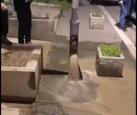 Kako se može videti, ulična rasveta radi normalno i svetli dok iz stuba šiklja prljava voda koja se najverovatnije tokom dužeg vremena nakupila u unutrašnjosti cevi.
