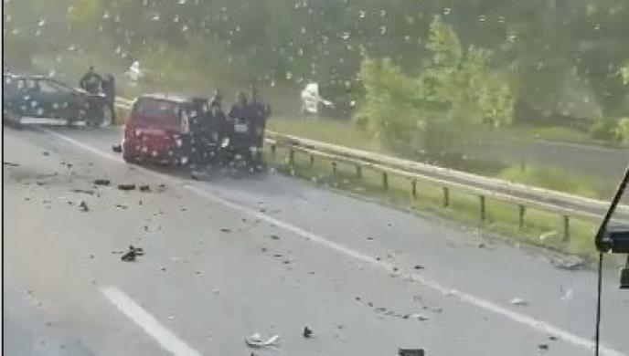 SAOBRAĆAJKA NA AUTO-PUTU KOD SKRETANJA ZA AERODROM: Automobili uništeni, delovi rasuti po putu VIDEO