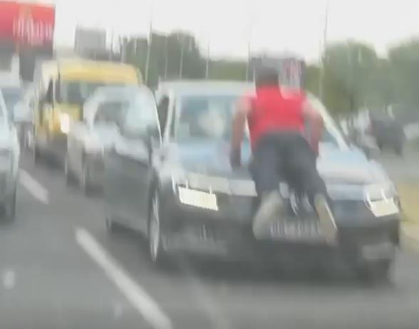 Ovoga puta na Instagram stranici serbialive_beograd objavljen je video snimak muškarca u crvenoj majici koji leži na haubi "folksvagena", dok drugi automobili prolaze.