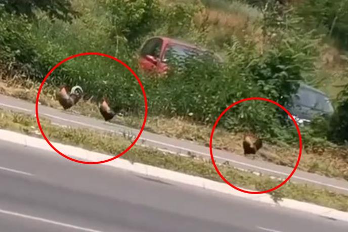 Na prometnoj saobraćajnici usred najveće gužve iznenada su se pojavile dve kokoške i petao. Koke su rutinski prošetale ne obazirujući se na automobile i kamione koji su jurili pored njih.