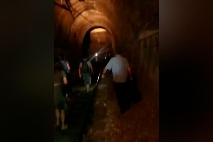 Na snimku koji je objavila Instagram stranica Serbia Live Beograd vidi se kako ljudi hodaju šinama kroz mračan tunel.
