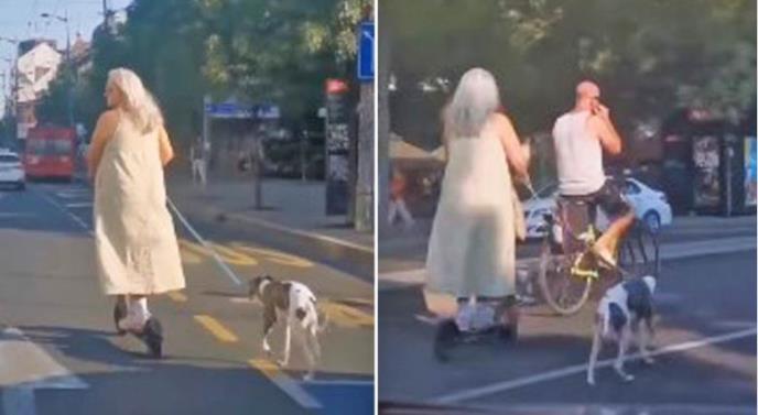 Nesvakidašnja scena snimljena je na Terazijama u Beogradu. Naime, na snimku koji se pojavio na društvenim mrežama vidi kako žena vozi električni trotineti prelazi iz trake u traku, pri tom držeći psa na uzici koji trči pored nje.