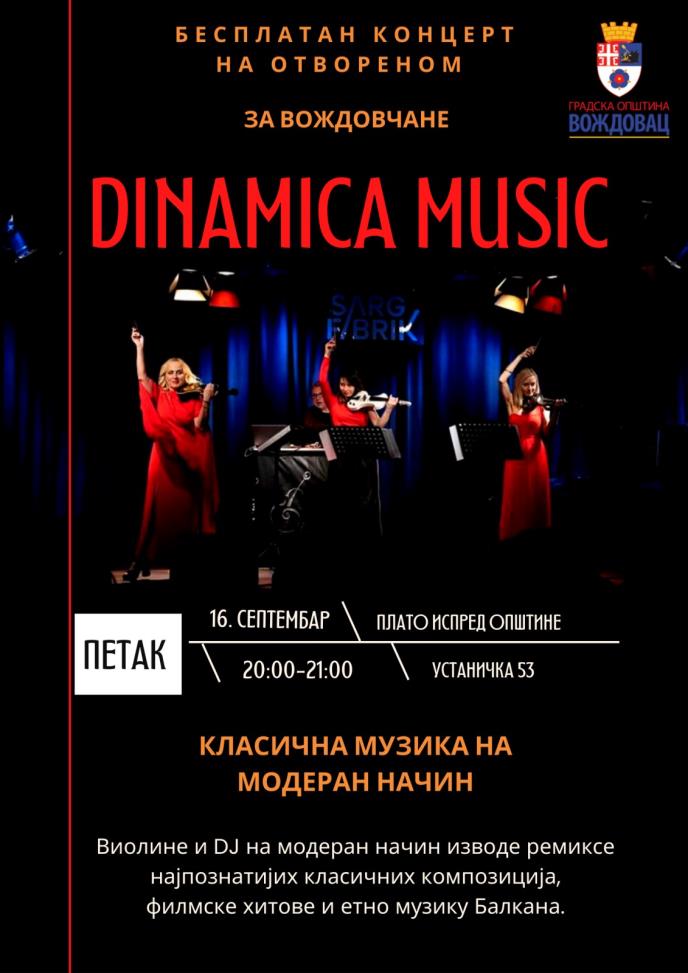 U petak, 16. septembra na Platou ispred Gradske opštine Voždovac, Ustanička 53, od 20:00 do 21:00 čas nastupa električni kvartet „Dinamika music“ -Klasična muzika na moderan način.