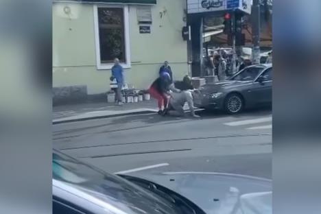 Na snimku se vidi kako muškarac i devojka motociklistu obaraju čoveka na ulicu, a u jednom momentu ga i dave. Nastao je opšti haos na ulici, a zaustavili su i saobraćaj.