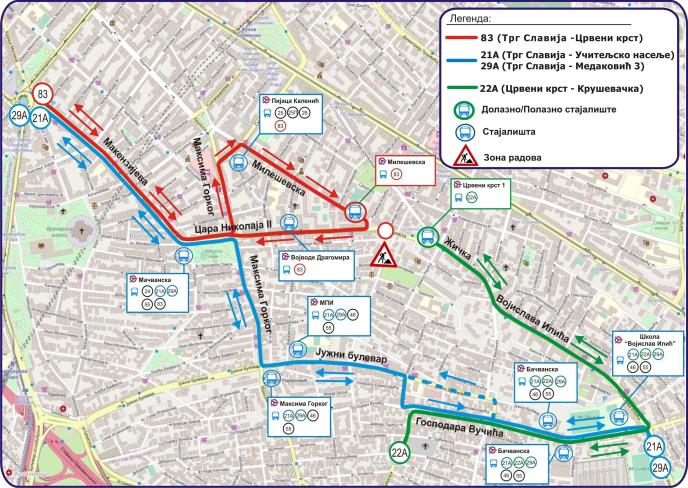Vozila sa linija 21A, 29A i E1 će saobraćati trasom: Trg Slavija – Makenzijeva – Cara Nikolaja II – Maksima Gorkog – Južni bulevar – Đerdapska (Grčića Milenka u smeru ka gradu), Gospodara Vučića – Vojislava Ilića i dalje redovno prema naseljima Medaković 3 i Učiteljsko naselje;