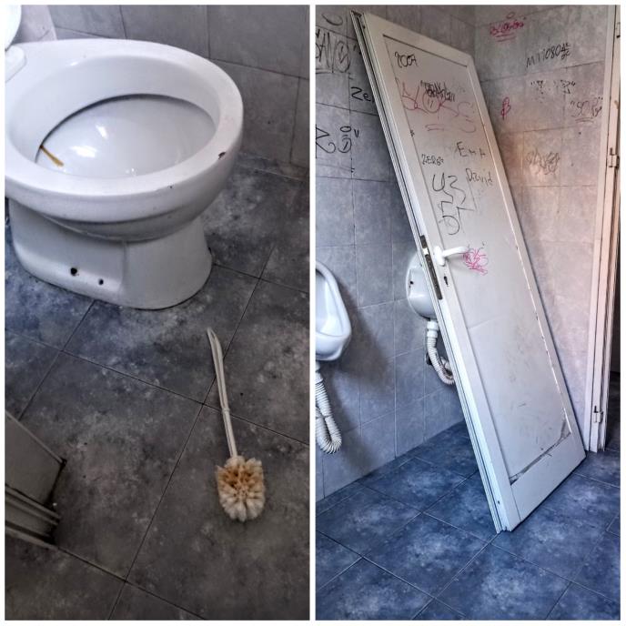 Na fotografijama za koje čitalac tvrdi da su iz učeničkog toaleta vide se išarane pločice, slomljena vrata, ali i prljva wc šolja i pisoar.