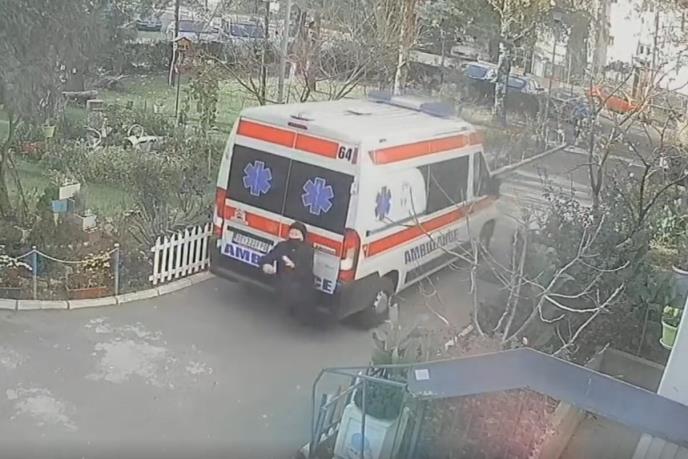 Žena je ostala zaglavljena ispod Hitne pomoći, a kako se vidi na snimku, vozilo se pod rotacijom kretalo u rikverc između zgrada.