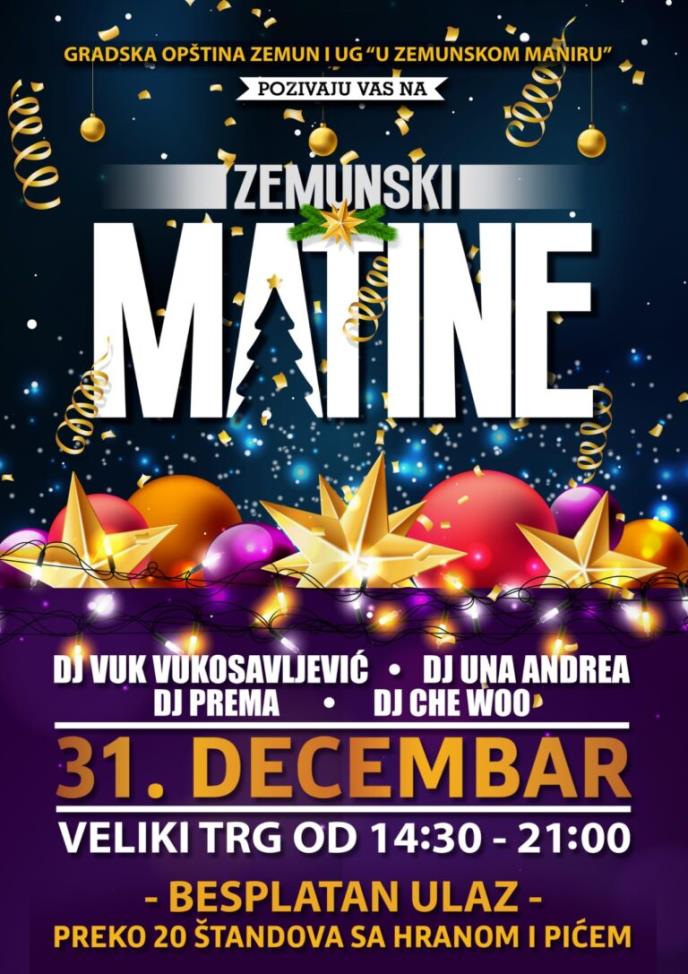 Gradska opština Zemun i Udruženje građana "U zemunskom maniru" pozivaju sve Zemunce, a i one koji se tako osećaju da dođu u subotu 31. decembra na veliki "Zemunski Matine". Tog dana, kako su naveli u saopštenju, Veliki trg u Zemunu "biće mesto najboljeg provoda i energije, i svi koji dođu će imati prilike da zaigraju u ritmu najboljih domaćih di džejeva, dožive nezaboravne trenutke koji su vredni pamćenja, i tako na pravi način isprate staru i pripreme se za doček Nove godine."