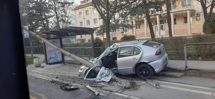 Za sada nije poznat uzrok, kao ni da li ima povređenih, ali je očigledno da se vozilo zakucalo u banderu i pritom je iščupalo i srušilo.