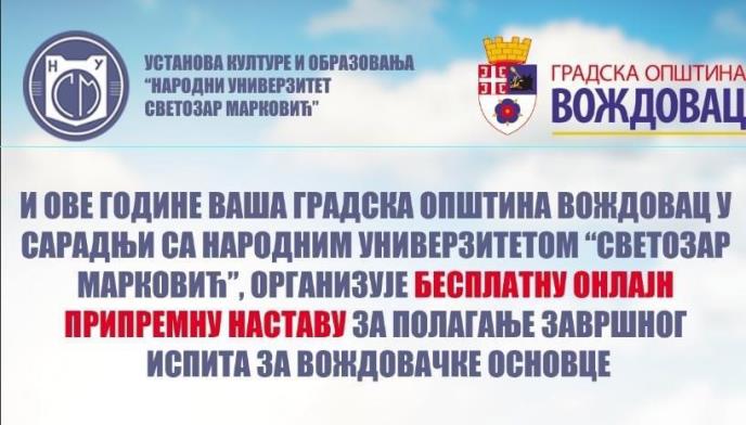 Opština Voždovac i Ustanova kulutre i obrazovanja „Narodni univerzitet Svetozar Marković“ pozivaju učenike završnih razreda osnovnih škola da se do 1. marta prijave na besplatne onlajn časove pripreme za polaganje završnog ispita.