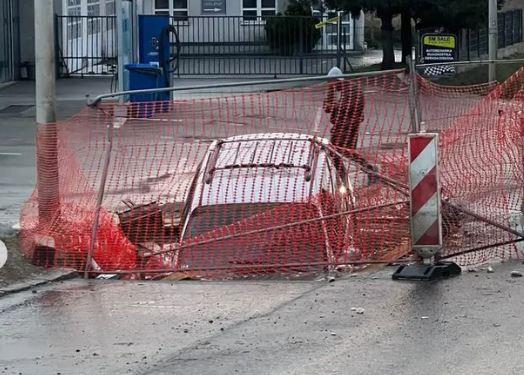 Naime čovek se automobilom "zakucao" u rupu na putu. Nije jasno kako je uspoe da uleti u rupu koja je bila propisno ograđena. Vozač je čitavim prednjim delom zaronio u ovaj "krater" na drumu.