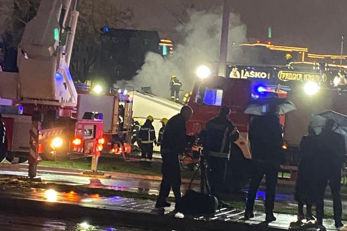 Na terenu se nalazi više vatrogasnih vozila, a vatrogasne ekipe pokušavaju da ugase vatru.