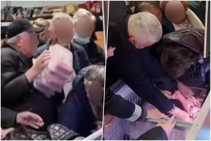 Guranje, laktanje i opšta makljaža izbili su zbog niže cene junećih i svinjskih ćevapa?! Snimak okršaja penzionera pojavio se i na društvenim mrežama, a na njemu se vidi jedna starija žena koja pokušava da uzme paket ćevapa dok istovremeno brani drugima da ih uzmu.