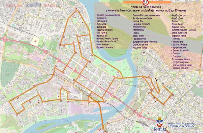 Na dan održavanja maratona, od 8.30 do 15 sati dolaziće do izmene režima saobraćaja i obustave saobraćaja na trasama maratona, polumaratona, trke na 10 kilometara i trke zadovoljstva, kao i na svim prilazima trasama u Bulevaru kralja Aleksandra, Beogradskoj, na Slaviji, Nemanjinoj, Balkanskoj, Gavrila Principa, Pop Lukinoj, Brankovom mostu, Bulevaru Mihajla Pupina, Bulevaru Nikole Tesle, Džona Kenedija, Bulevaru umetnosti, Bulevaru Milutina Milankovića, Antifašističke borbe, Mostu na Adi, Milentija Popovića, Karađorđevom trgu, Karađorđevoj, Glavnoj, Bežanijskoj, Tošinom bunaru, Pariske komune, Bulevaru maršala Tolbuhina, Otona Župančiča, Narodnih heroja, Zemunskoj, Vojvođanskoj, Dr Ivana Ribara, Jurija Gagarina (od Bulevara Milutina Milankovića do Ulice Dušana Vukasovića), Dušana Vukasovića, Evropskoj (od Dušana Vukasovića do Gandijeve), Gandijevoj (od Evropske do Jurija Gagarina), Omladinskih brigada, Đorđa Stanojevića, Bulevaru Crvene armije i u Ulici kraljice Natalije.