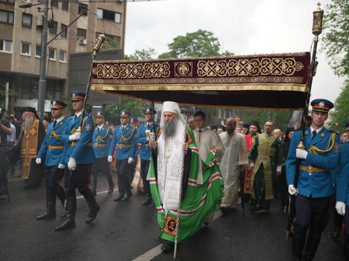 Uz patrijarha Porfirija i crkvene velikodostojnike na čelu litije, pored moštiju Svetog vladike Nikolaja Velimirovića, se nalaze i gradonačelnik Aleksandar Šapić, ministri Miloš Vučević i Nikola Selaković, gradski menadžer Miroslav Čučković, košarkaš Dejan Tomašević, i mnogi drugi.