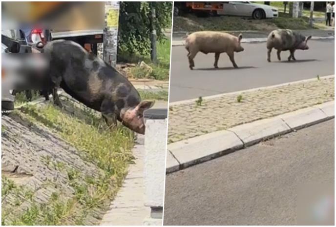 Na snimku se vidi kako se svinje nonšalantno šetkaju asfaltom, sasvim opušteno, ne hajući za ljude unaokolo.