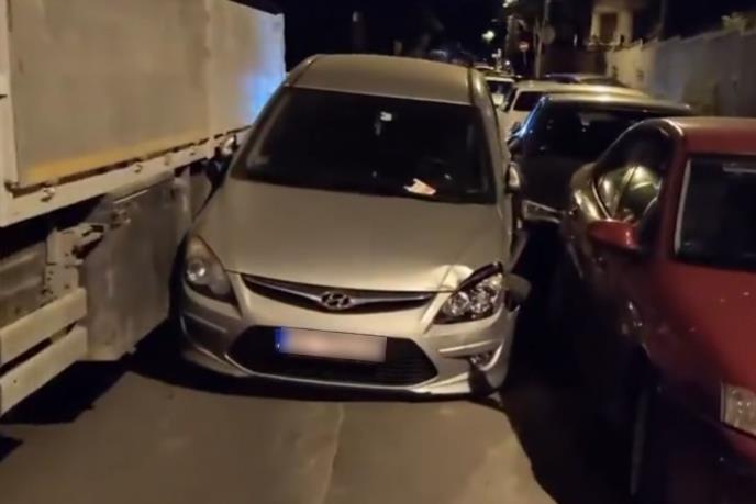 Naime, na snimku se vidi kako, dok kamion pokušava da prođe, vuče za sobom automobil i tako pričinjava materijalnu štetu na parkiranim vozilima.