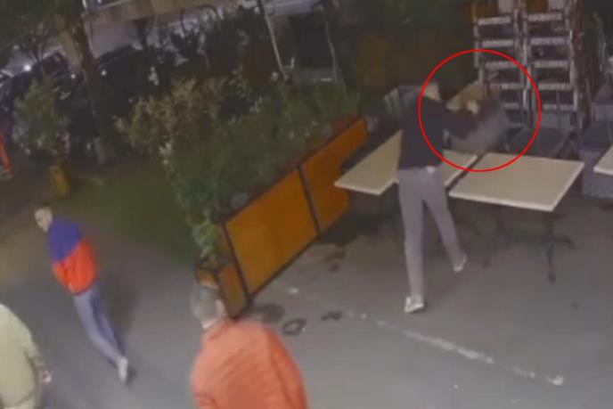 Sigurnosne kamere na jednom kafiću u Beogradu snimile su grupu mladića dok je prolazila pored ovog lokala, da bi potom jedan od njih uzeo stolicu i nastavio svojim putem.