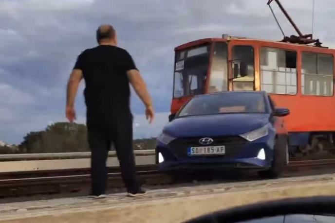Automobil "hjundai" završio je na tramvajskim šinama. Zasad nije poznato kako je vozaču ovo pošlo za rukom jer se između leve trake i šina nalazi betonska bankina visoka čitav metar.
