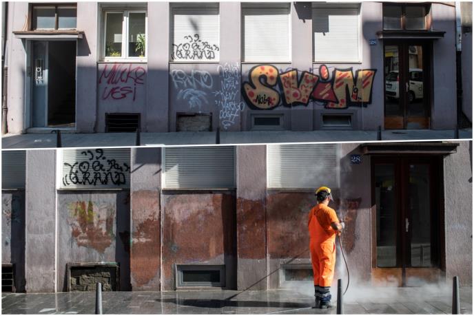 Neprimereni grafiti i druge žvrljotine koje su krasile zgrade užeg jezgra i dalje s vremena na vreme osvanu na fasadama, ali vrlo brzo nestanu pod mlazom vode.