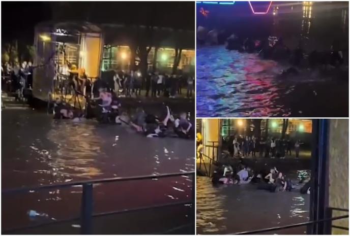 Prilaz do splava je u potpunosti potonuo, a deo gostiju krenuo je ka obali kroz mrkli mrak i ledenu vodu. Na snimku se čuje žamor, vika, cika i vrisci devojaka.