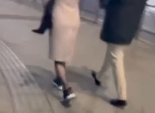 Na snimku se vidi devojka koja na nogama ima patike bar pet, šest brojeva veće, dok pored nje ide mladić - bos!