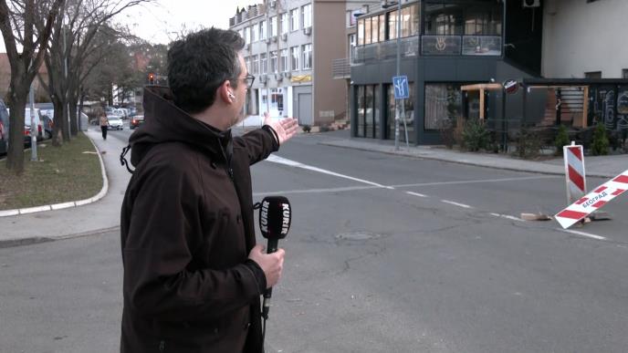 - E sada, možda je problem do ovoga, dok smo mi čekali na ovo uključenje, videli smo da vozači Jablaničkom ulicom voze malo brže. Čak sam i sada svedok nekoliko nepropisnih preticanja u ovoj ulici, ali opet moram da napomenem i da možda ova rupa koja se nalazi na putu nije baš najsjajnije obeležena. Da, nalaze se ova dva manja znaka, ali možda bi trebalo ranije da se obeleži kako bi vozači koji se spuštaju na Jablaničku ulicu znali da se ovde nalazi jako velika rupa. Sva sreća što niko nije sedeo u bašti kafića noćas da bi možda pričali o tragediji, a ne samo o jednoj bizarnoj nesreći.