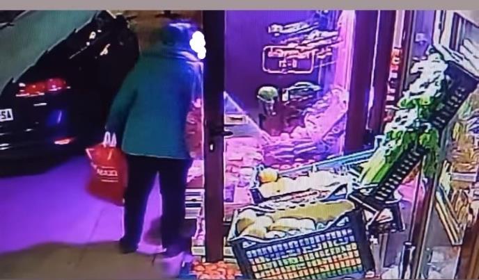 Na snimku se vidi žena koja prolazi pored piljare u večernjim satima, razgleda robu noseći kese i torbe i odjednom u džep stavlja povrće.