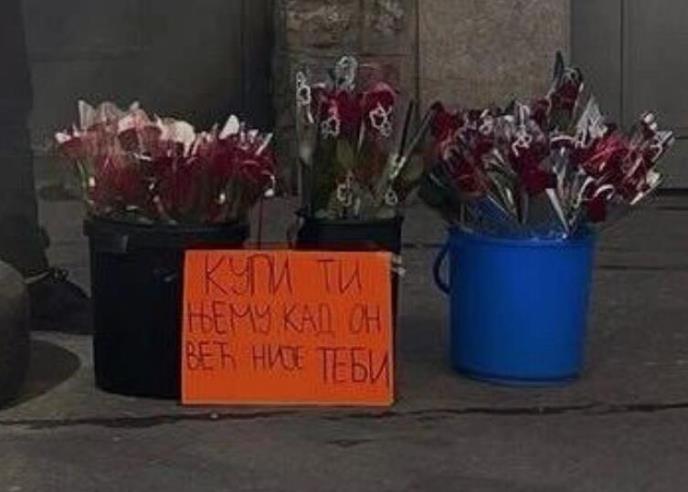 Jedan od mladića sa Zvezdare u rukama drži papir sa porukom: "Kupi ti njemu, kad on već nije tebi", aludirajući na to da sve manje muškaraca poklanja cveće svojim partnerkama.