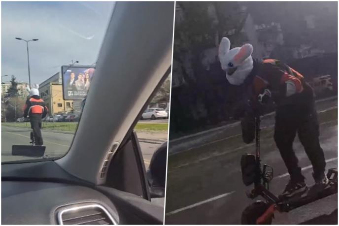 Naime, suvozač u jednom automobilu snimio je muškarca na električnom trotinetu, sa neobičnom kacigom nalik na zeca na glavi.