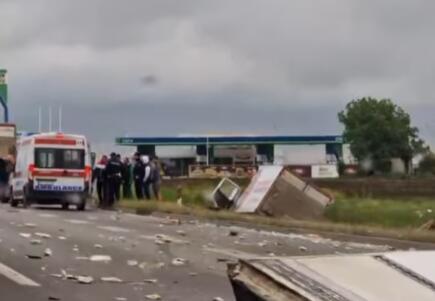 Kako se vidi na snimku, jedan kamion koji stoji na putu teško je oštećen, dok je drugi sleteo u jarak. Po putu su rasuti delovi.
