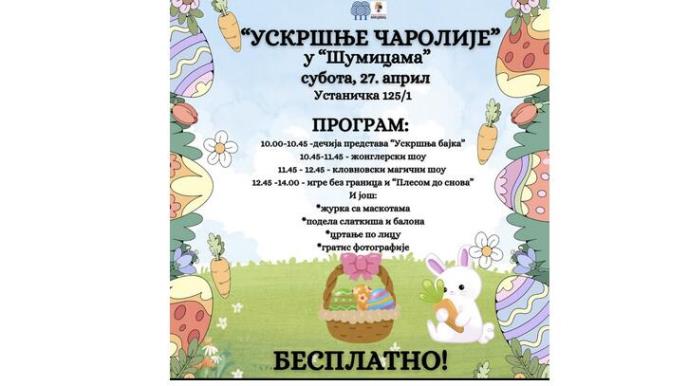 U susret najradosnijem hrišćanskom prazniku Vakrsu, manifestacija „Uskršnje čarolije” održaće se 27. aprila od 10 do 14 časova u Sportskom centru „Šumice”, saopšteno je iz ove sportske ustanove. Ulaz je slobodan za sve programe, a organizatori najavljuju mnoštvo kvalitetnog i zabavnog sadržaja za najmlađe sugrađane.