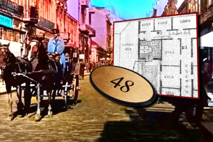 Nacrt rasporeda u Palasu sa posebno obeleženom sobom 48 u kojoj se desio zločin i navodna putanja kojom je pobegao atentator