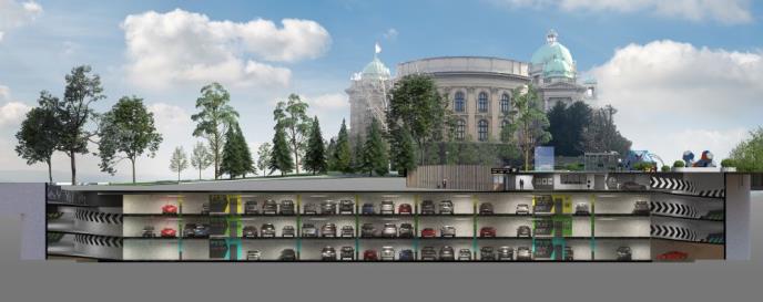 Ova garaža u okviru kompleksa oko Narodne skupštine Srbije površine od oko 10 hiljada kvadratnih metara, imaće 284 nova parking mesta raspoređena na četiri nivoa..