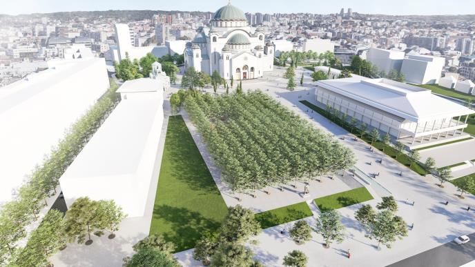 Prostor s leve strane Hrama Svetog Save biće ozelenjen, uređen parkovski prostor, od Narodne biblioteke Srbije odvojen šetalištem sa kojeg će se otvarati pogled ka Hramu.