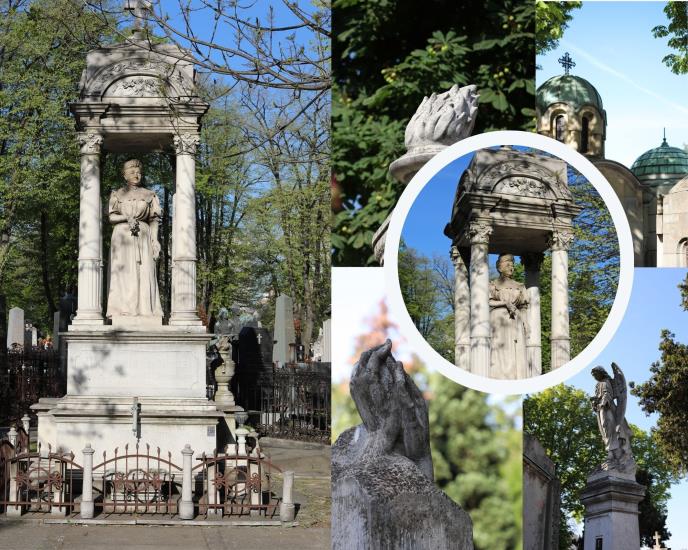 U senci stoletnih stabala preko puta crkve Sv. Nikole na Novom groblju u Beogradu može se videti izuzetna skulptura Dame u krinolini, delo čuvenog italijanskog vajara, đenovljanina Ahile Kanesa (1856-1905).