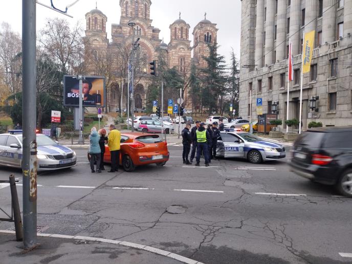 Saobraćajna nezgoda u kojoj su učestvovali policijsko i jedno putničko vozilo dogodila se danas nešto pre 9 časova na raskrsnici Takovske i Kosovske ulice.