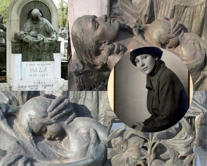 U najskrivenijem kutku Novog groblja, pod senkom stoletnih stabala, nalazi se jedan od najupečatljivijih, a po mišljenju nekih istoričara umetnosti i najvrednijih umetničkih radova na ovom groblju. Visoki reljef prikazuje hirsta Spasitelja, sa usnulom mladom ženom u naručju, za čije se skute grčevito drži dečačić zaspao u večnosti. Devojčina duga talasasta kosa je naizgled još uvek vlažna, kao da je upravo izašla iz vode. Na spomeniku od belog kamena stoji kratak natpis: “U SMRT ZA DRUGOGA” – NADA 1896-1922. Ovaj visoki reljef simbolične sadržine nalazi se na porodičnoj grobnici Tomić - Tomanić, a posvećen je Nadeždi Nadi Tomić, mladoj ženi koja je izgubila život u tamnim vodama Ženevskog jezera pokušavajući da pomogne malom davljeniku.U najskrivenijem kutku Novog groblja, pod senkom stoletnih stabala, nalazi se jedan od najupečatljivijih, a po mišljenju nekih istoričara umetnosti i najvrednijih umetničkih radova na ovom groblju. Visoki reljef prikazuje hirsta Spasitelja, sa usnulom mladom ženom u naručju, za čije se skute grčevito drži dečačić zaspao u večnosti. Devojčina duga talasasta kosa je naizgled još uvek vlažna, kao da je upravo izašla iz vode. Na spomeniku od belog kamena stoji kratak natpis: “U SMRT ZA DRUGOGA” – NADA 1896-1922. Ovaj visoki reljef simbolične sadržine nalazi se na porodičnoj grobnici Tomić - Tomanić, a posvećen je Nadeždi Nadi Tomić, mladoj ženi koja je izgubila život u tamnim vodama Ženevskog jezera pokušavajući da pomogne malom davljeniku.