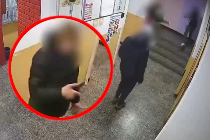 Na jednom od snimaka sa nadzorne kamere vidi se kako grupica od šest dečaka ulazi u zgradu, dok drugi prikazuje trojicu dečaka u hodniku kako prilaze jednom stanu, gde jedan od dečaka udara nogom u vrata, posle čega beže dalje u unutrašnjost zgrade.