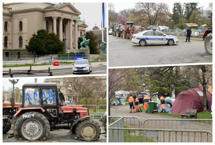 I jutros je policija prisutna oko Pionirskog parka, doduše u manjem broju nego prethodnih dana, ali je situacija mirna. Traktori koji su postavljeni oko parka uništeni su, a neki su čak i potpuno demolirani.