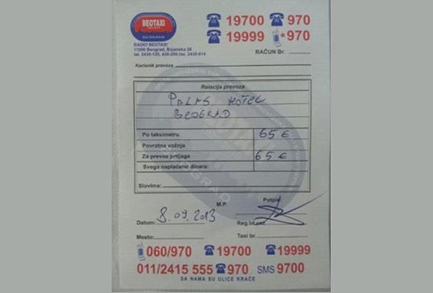 Sudeći prema informaciji koju šeruju korisnici Twittera, sa "dokaznim materijalom", odnosno računom, taksista je gošći iz Francuske za vožnju od beogradskog aerodroma "Nikola Tesla" do hotela "Palas" u centru grada naplatio neverovatnih 65 evra.