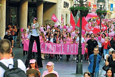 Stotine ljudi obučenih u roze majice i mnogobrojne poznate ličnosti prošetali su juče Knez Mihailovom ulicom u Beogradu. Tom prilikom upozoreno je da u Srbiji od raka dojke godišnje oboli oko 4.000 žena, a 1.600 umre od posledica ove bolesti.