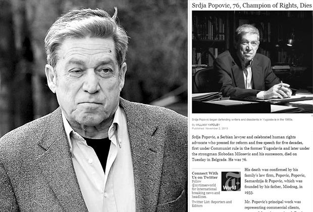 Čuveni američki list Njujork tajms objavio je da je u utorak u Beogradu preminuo Srđa Popović, advokat i proslavljeni srpski borac za ljudska prava, „koji se borio za reforme i slobodu govora pet decenija, prvo pod komunističkom vlašću u bivšoj Jugoslaviji, a kasnije za vreme predsednika Slobodana Miloševića i njegovih naslednika“.