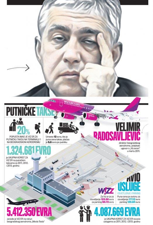 Naime, prema ugovoru koji je Velimir Radosavljević, direktor beogradskog aerodroma, potpisao s „Viz erom“ u martu 2011. godine, ova niskotarifna mađarska kompanija dobila je ogromne popuste od beogradskog aerodroma. Zahvaljujući tim privilegijama, kompanija je samo na popustima za putničke takse i avio-usluge u poslednje tri godine zaradila 5,4 miliona evra.
