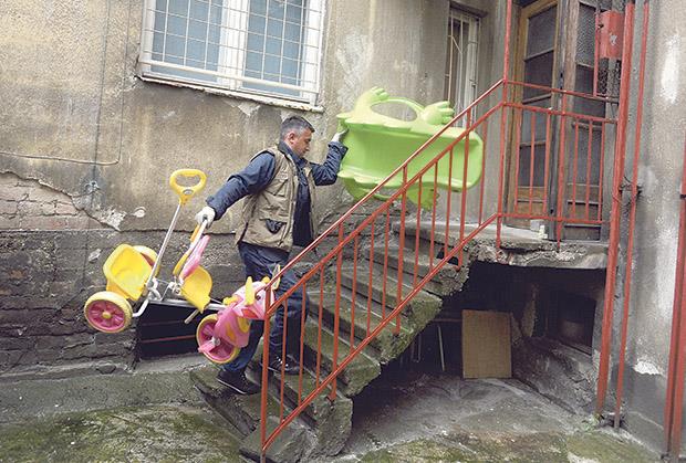 Posle godinu dana tužbi i intervencija komunalne inspekcije, komunalni inspektor je u pratnji radnika došao i odneo sporne igračke, a slika ovog čina svakoga navodi na pitanje da li je moguće da su u oronulom sivom dvorištu komšinici smetale baš šarene dečje igračke, koje su zavučene ispod stepeništa.