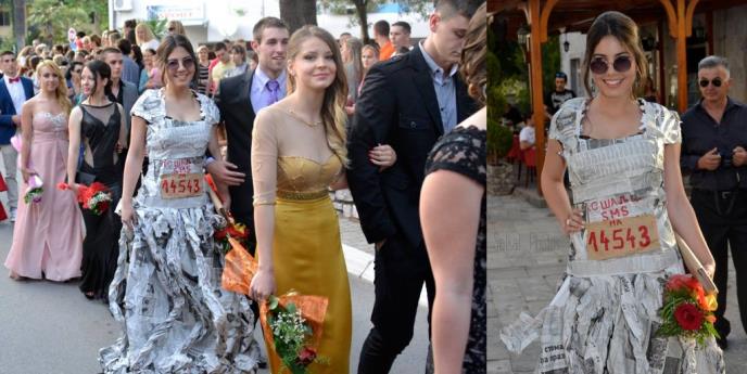 Njena haljina sačinjena od papira novina na sebi ima poruku kao poziv da pošaljete sms na 14543 i tako pomognete poplavljenim područjima. Ova haljina je proglašena za najlepšu matursku na proslavi jedne srednje škole u Tivtu.