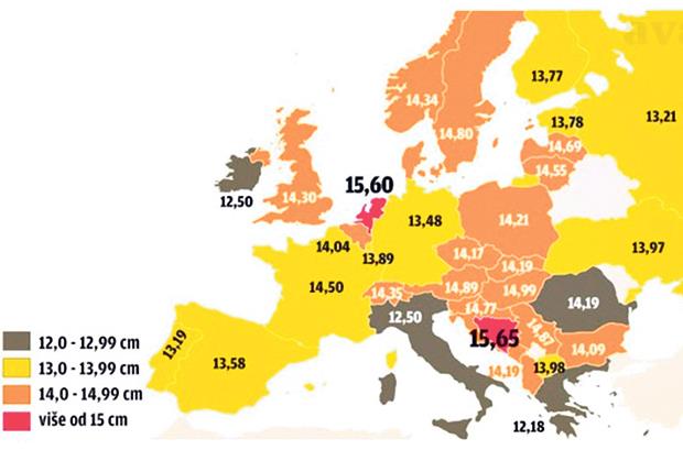 Prema ovim podacima, Srbi imaju za 10 milimetara veći polni organ od Hrvata. Takođe, ovi podaci pokazuju da prosečna dužina penisa u erektivnom stanju u Evropi iznosi 14,5 centimetara. Najobdareniji su Bosanci i Hercegovci s prosečnom dužinom od 15,65 centimetara, ispred Gruzijaca sa 15,61 centimetar i Holanđana, čiji polni organ ima prosečnu dužinu od 15,60 centimetara.