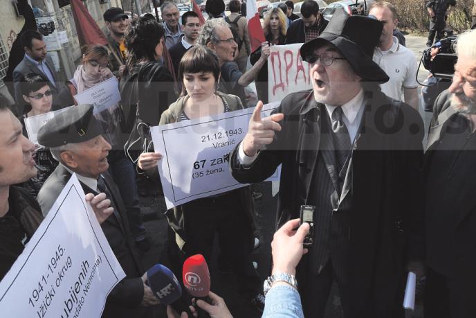 - Dražo, ubico, Stop rehabilitaciji fašiste, ratnog zločinca - vikali su mladići, zbog čega je nekoliko ročišta u Višem sudu prekinuto.