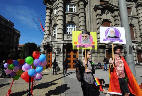 BEOGRAD - Tokom Parade ponosa učesnici su nosili transparente na kojima je ispod fotografija patrijarha Irineja i mitropolita Crnogorskog-primiroskog Amfilohija pisalo "Milion dolara dajem da budeš moj".